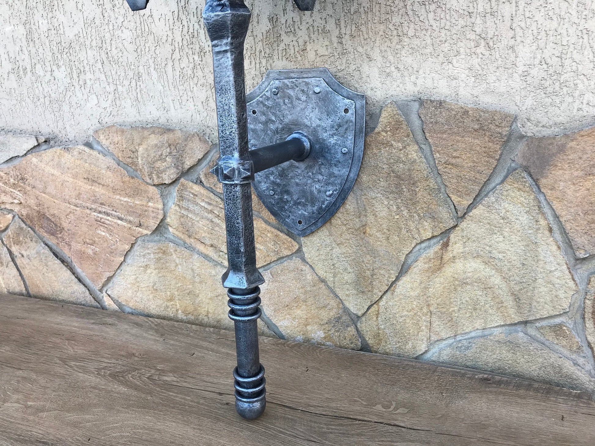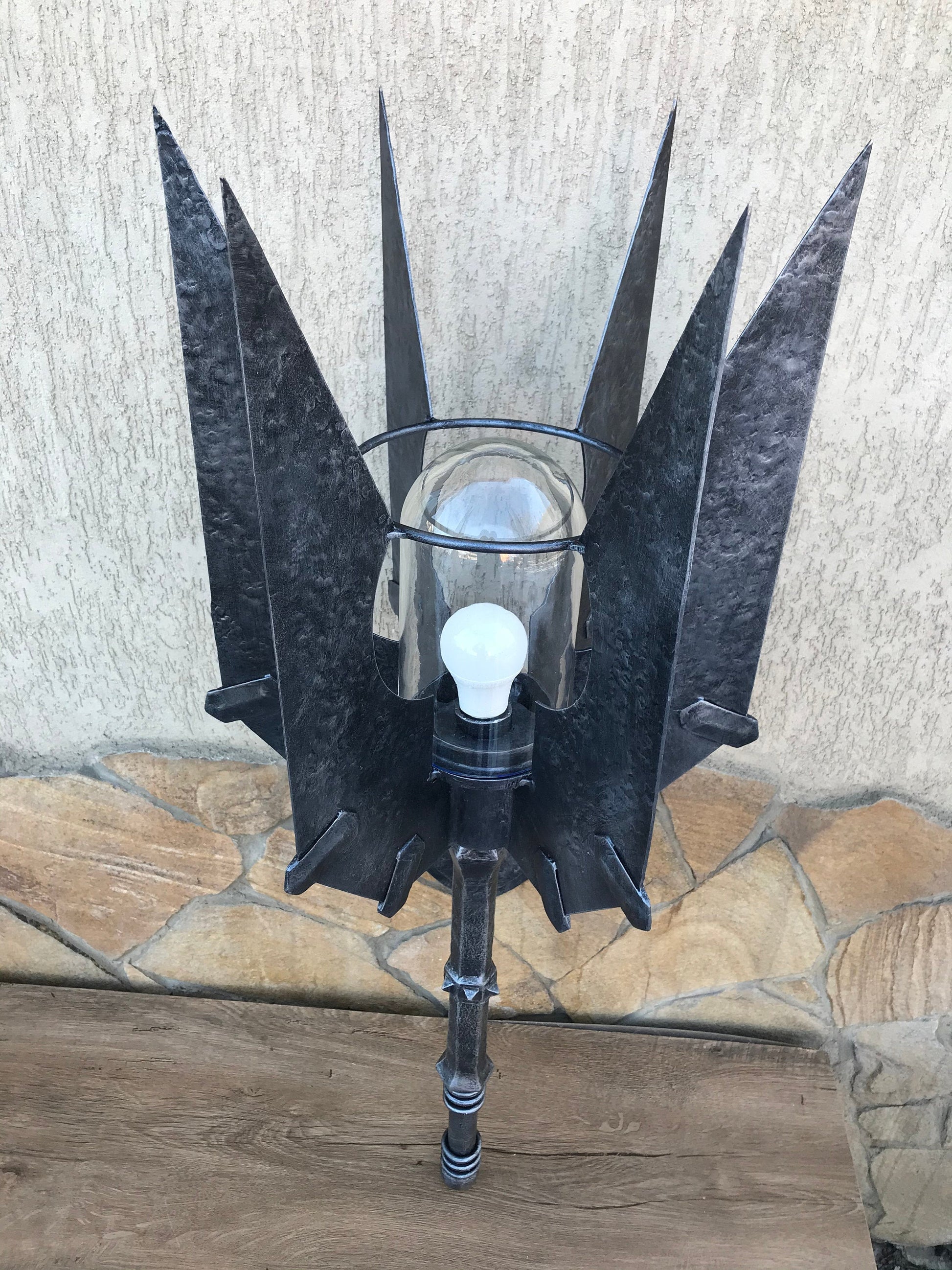 Here is a hand forged sconce in a view of Sauron's mace made of steel for both indoor and outdoor use. A hand forged replica of Sauron's mace. It is a functional piece of art!