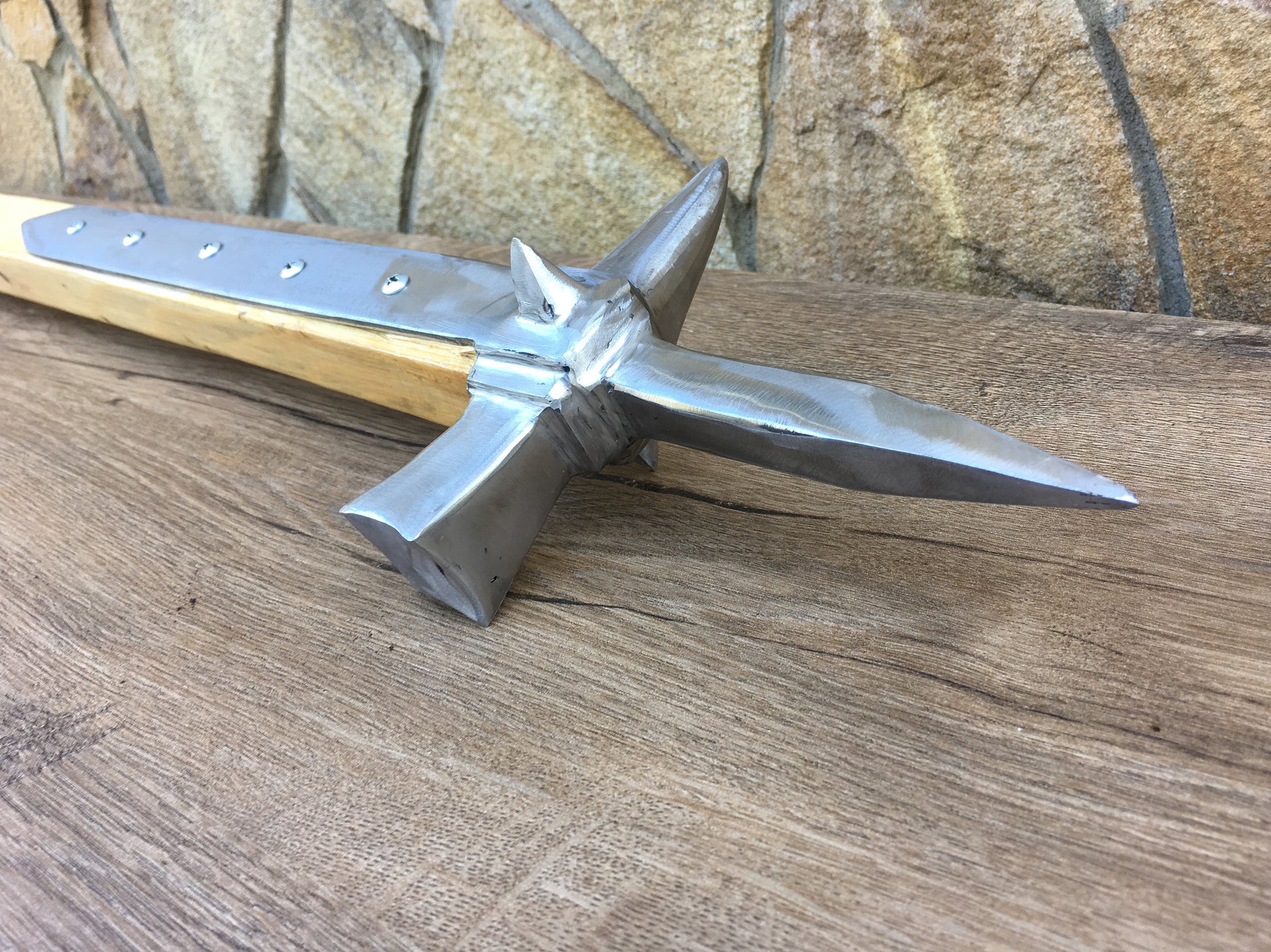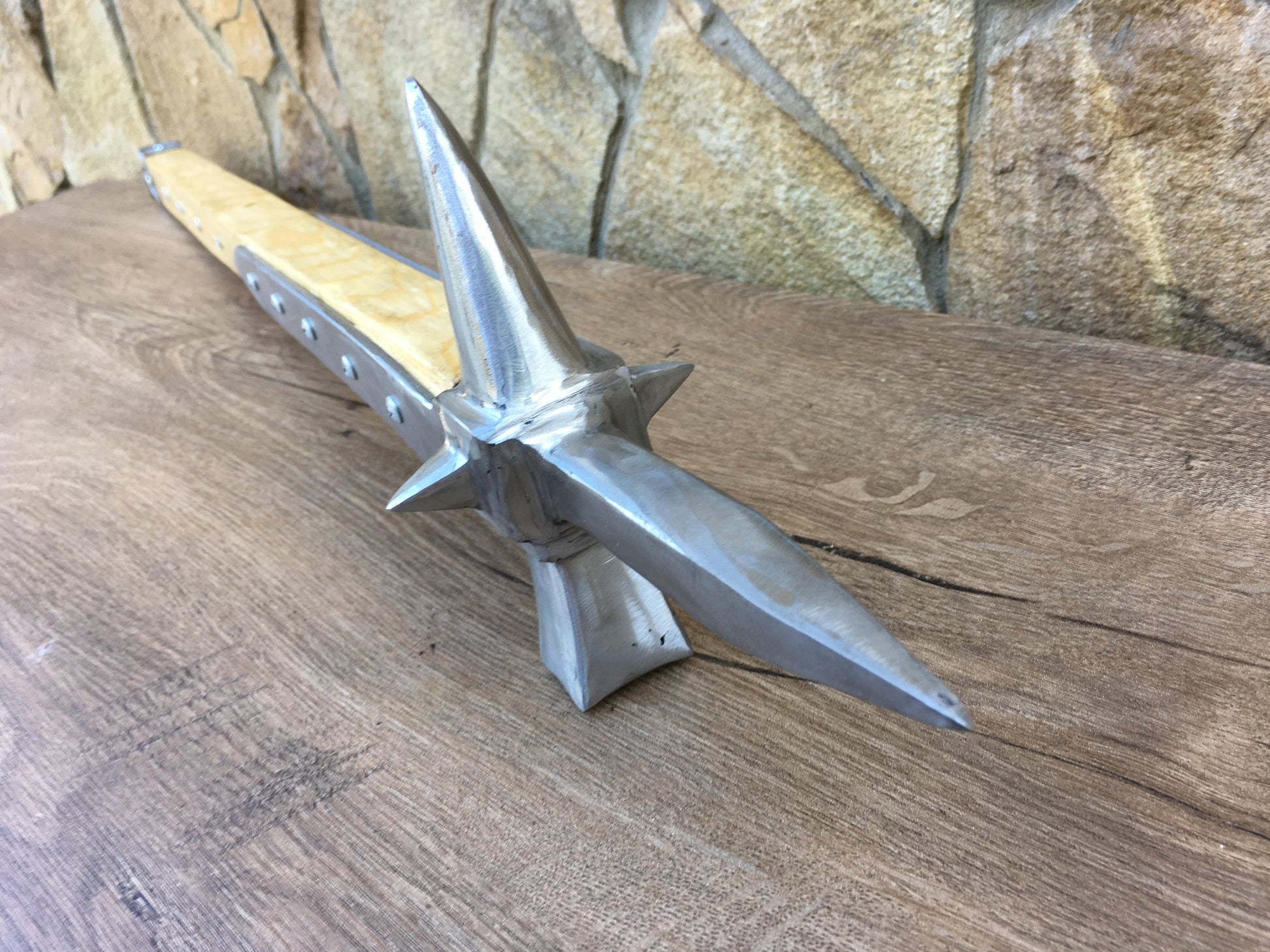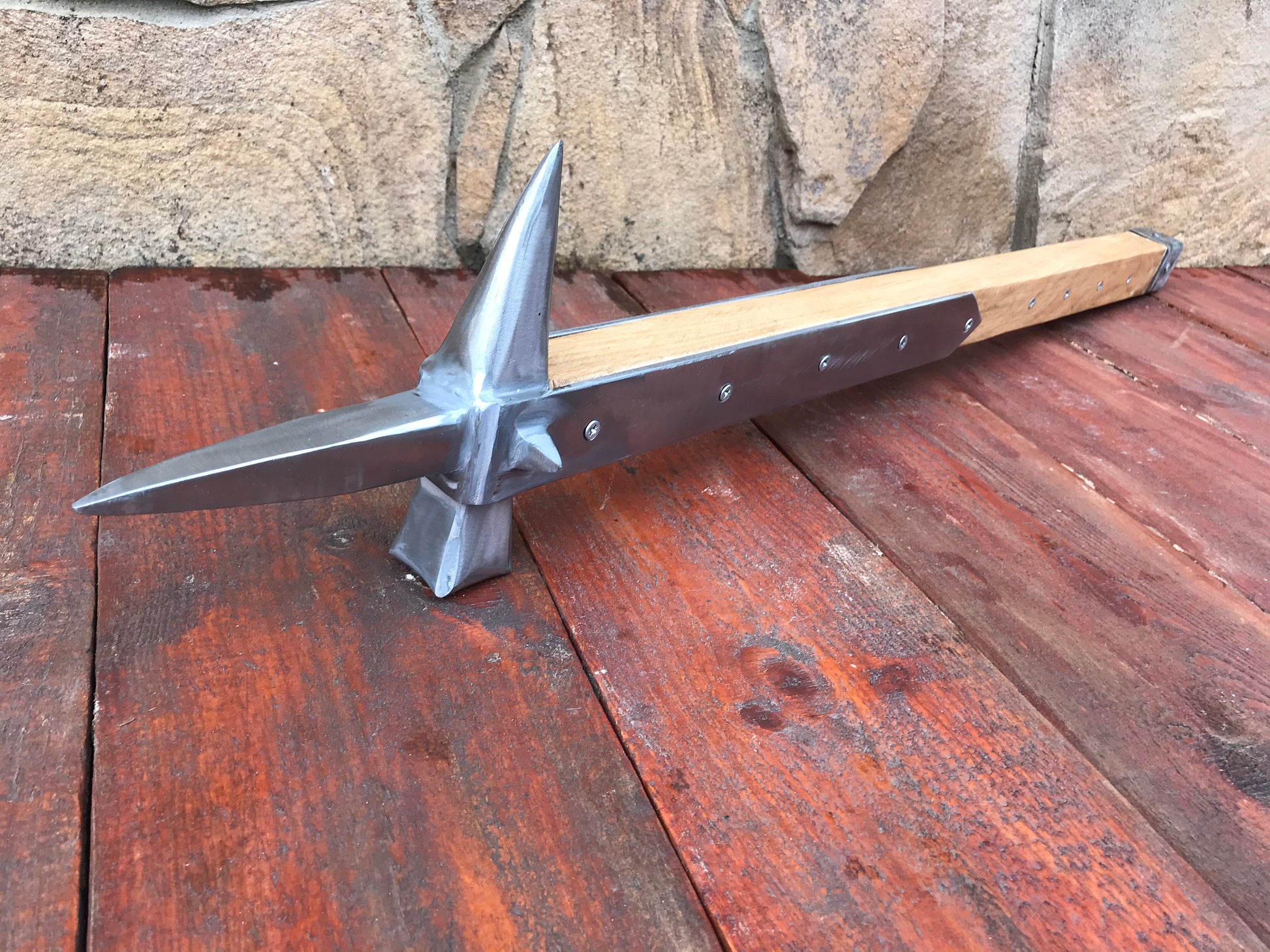 This war hammer has two very powerful spikes – one for piercing armour and balancing the flat head, and the other at the top for deadly thrusts. The long straps that keep the head on the shaft also come to a spiky point. The shaft is made of wood spiked with steel studs for more holding power.