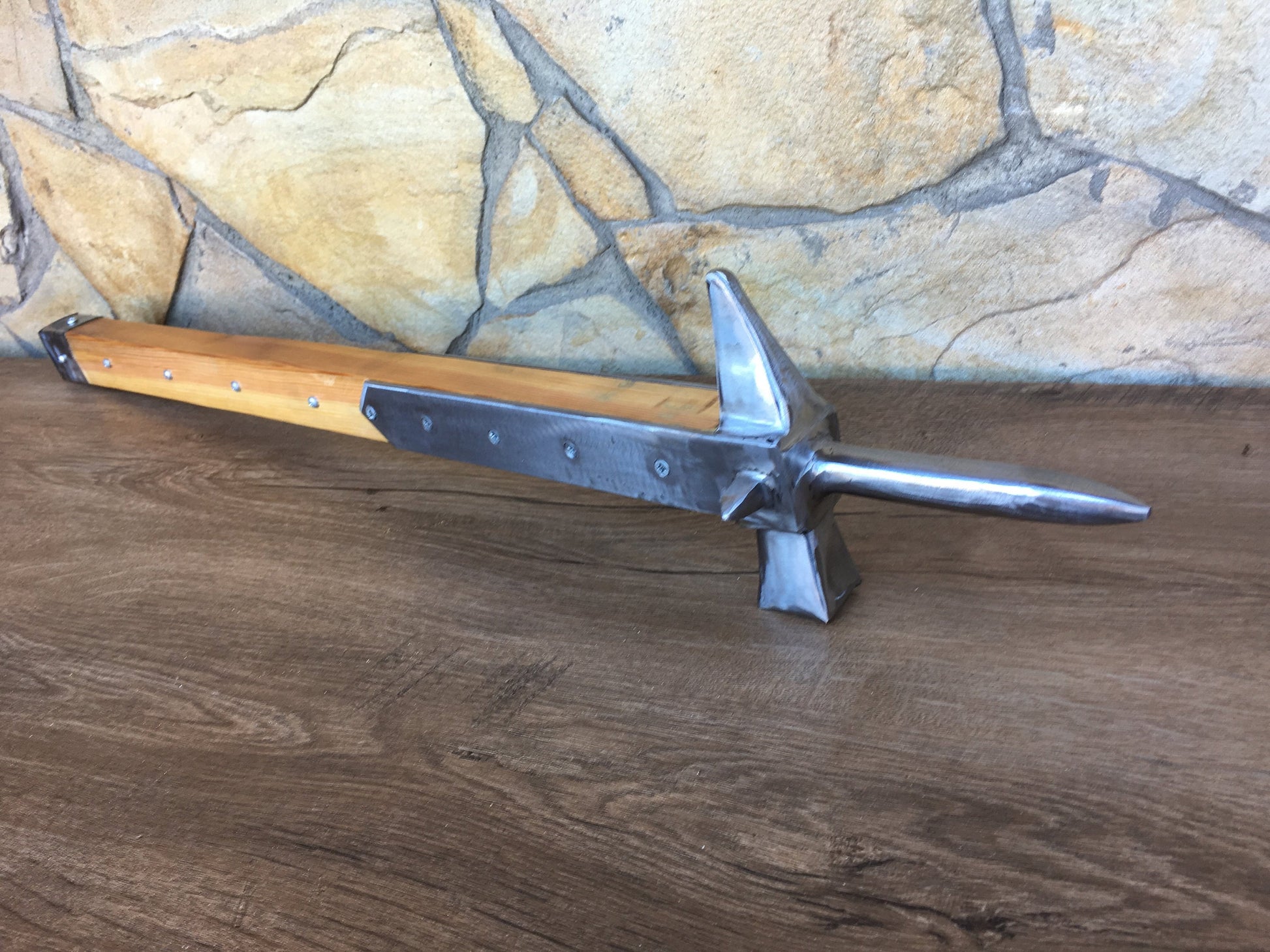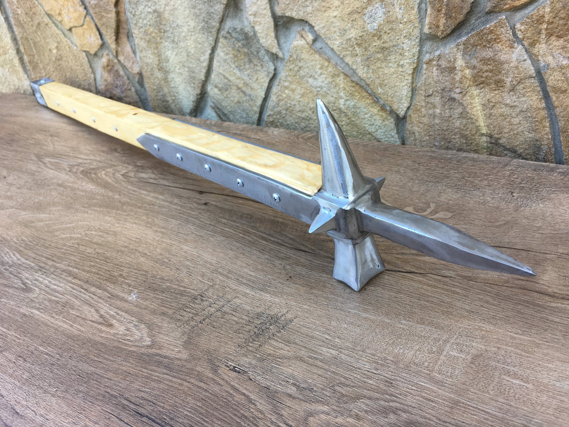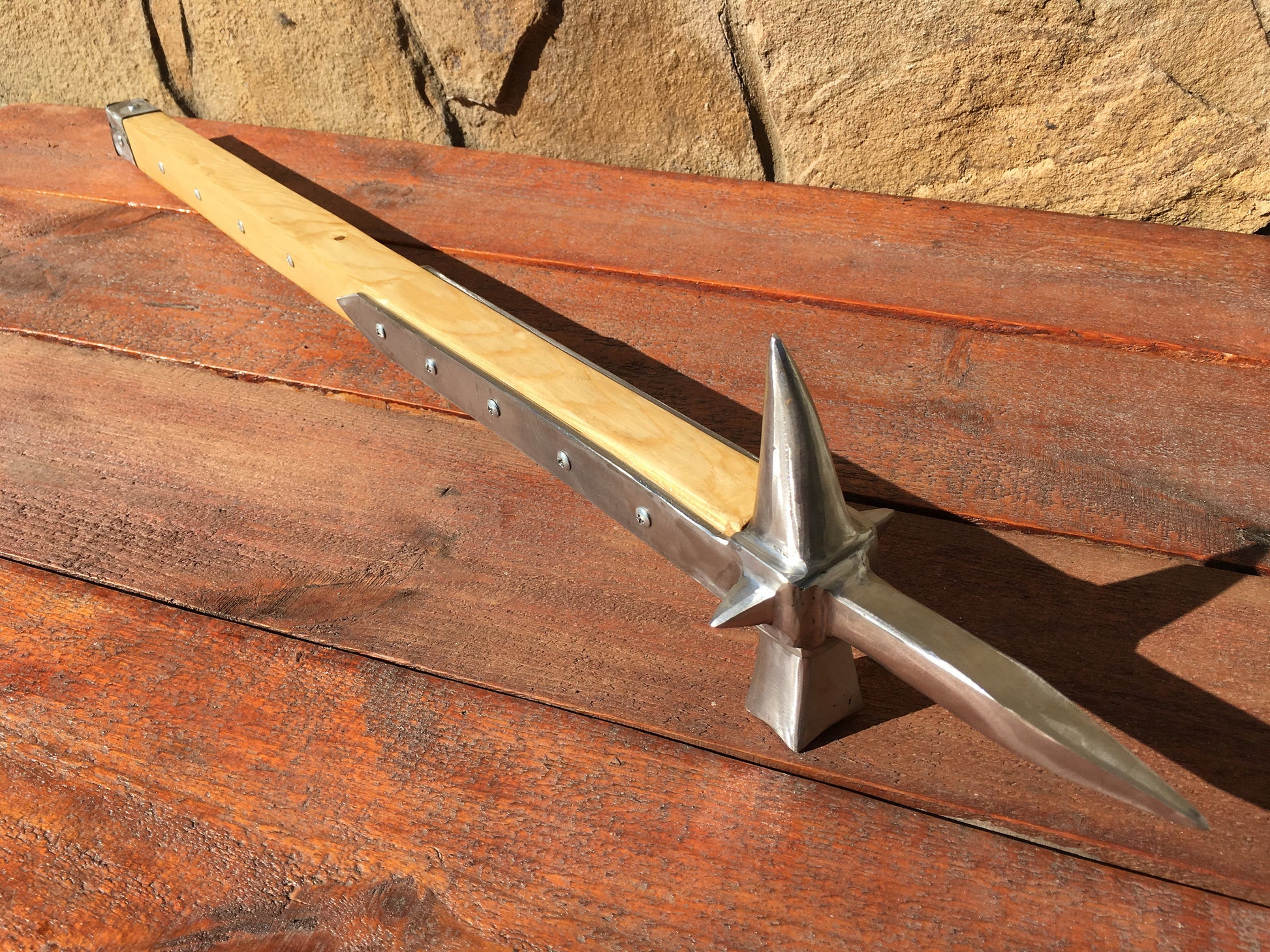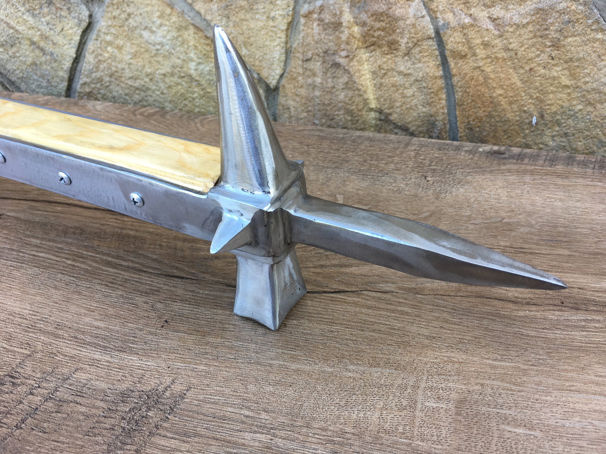 This war hammer has two very powerful spikes – one for piercing armour and balancing the flat head, and the other at the top for deadly thrusts. The long straps that keep the head on the shaft also come to a spiky point. The shaft is made of wood spiked with steel studs for more holding power.