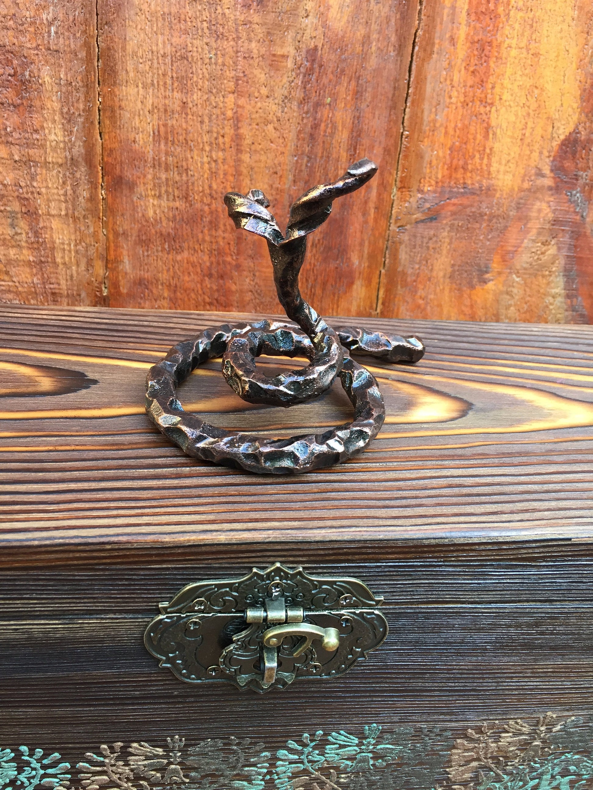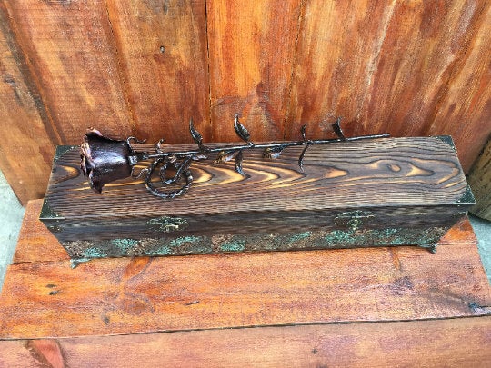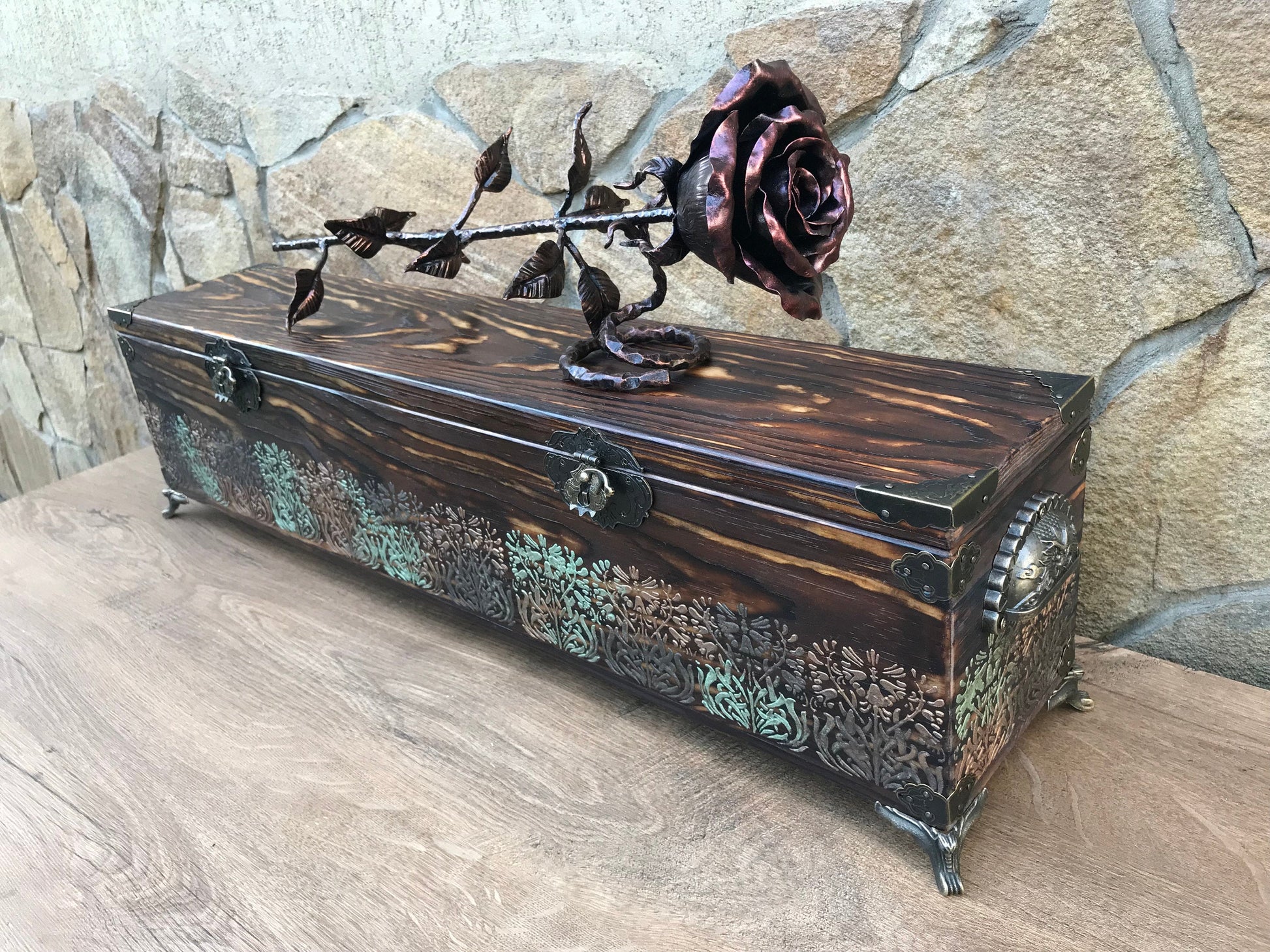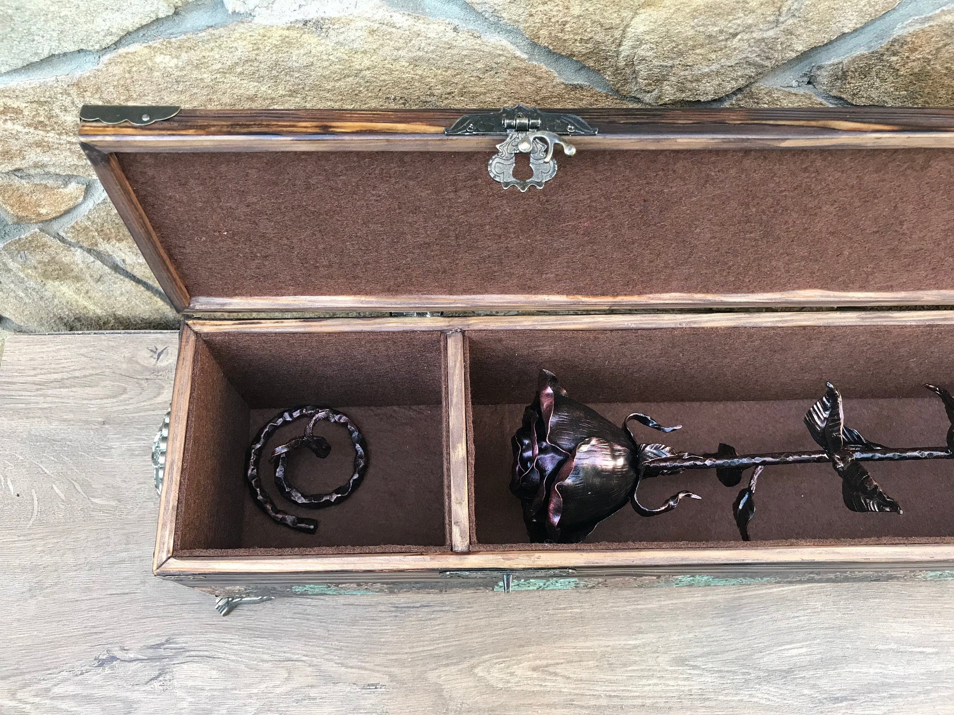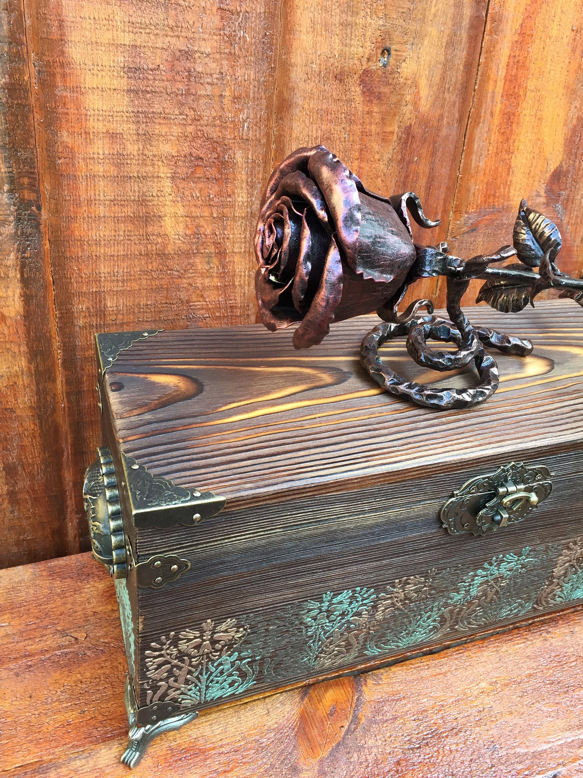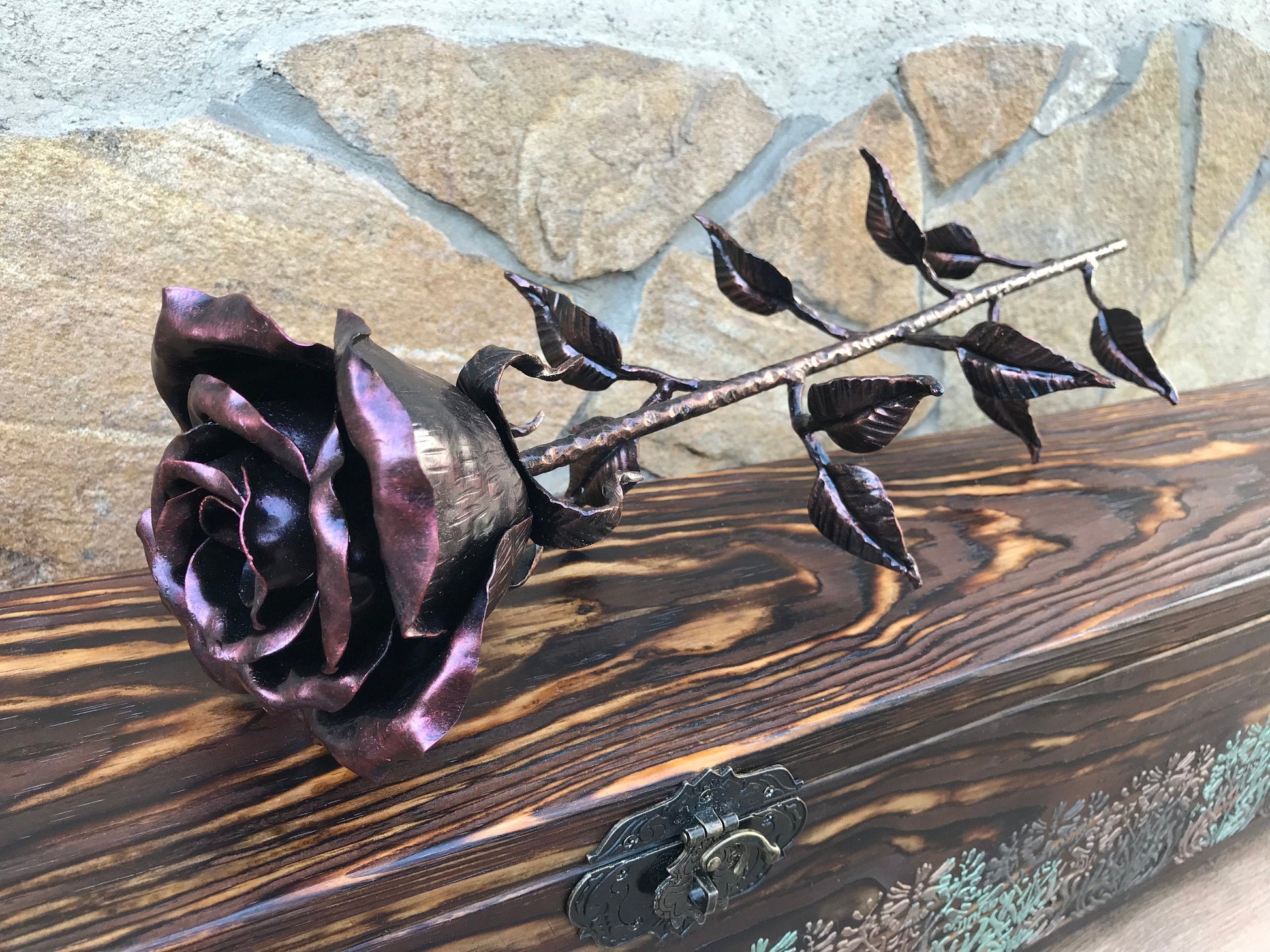 Are you looking for a gift on wedding anniversary? Already 5th, 6th, 11th, 20th wedding anniversary? It is called "wood anniversary", "steel anniversary", "iron anniversary", "ruby anniversary" and an iron gift, ruby gift, wooden gift for this occasion will be justified. Here is a forged metal rose in a wooden case (made in a view of a casket) which could be a nice gift for your girl/woman. It looks very festive and decorative! It deserves to be a cool gift!