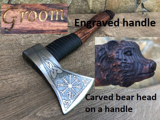 The listing price includes the axe, personalization/engraving on a handle (name, date, short message), carved bear head (or any other animal/bird you prefer).