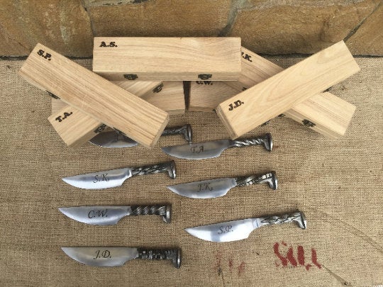 Here is a set of hand crafted knives (a handle - in a view of twisted cubes, twisted wave, pine-apple) in a wooden box (casket). This is a great groomsmen gift, corporate gift, usher gift, groom gift, father of the bride gift, 6th anniversary gift (iron year), 11th anniversary gift (steel year), Father's Day, Christmas gift for a grandfather or any other gifting occasion.
