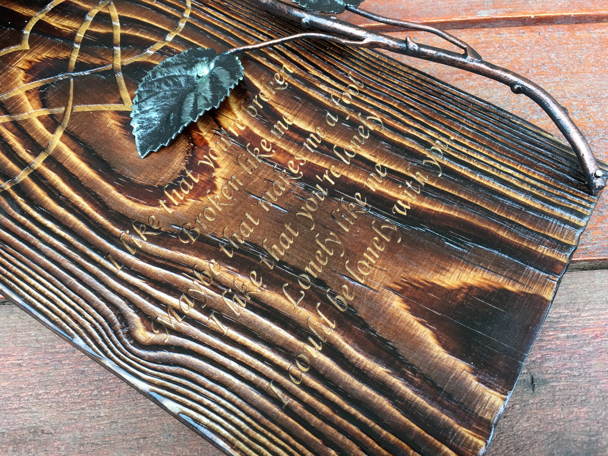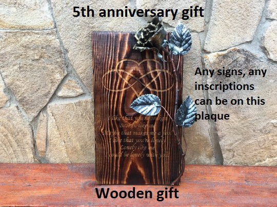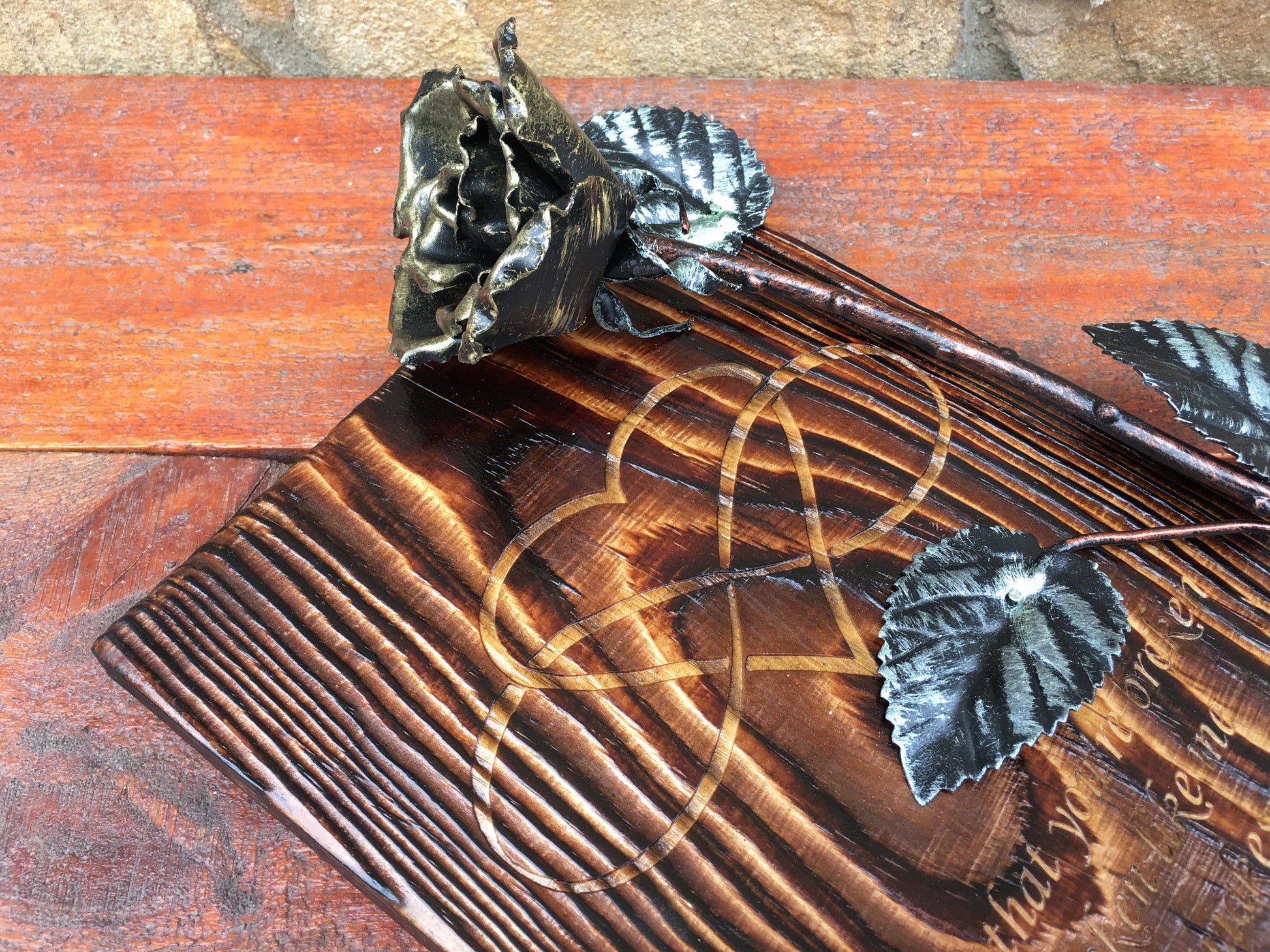 Here is a wooden plaque with the engraved heart and infinity sign and a message which could be a nice wooden gift for your girl/woman/wife. A hand forged rose attached to it makes it more awesome.