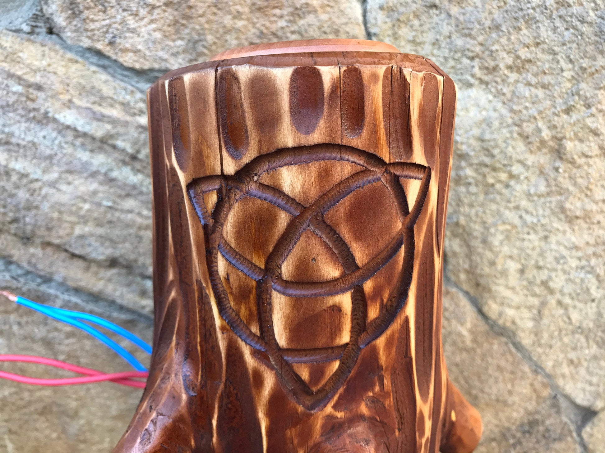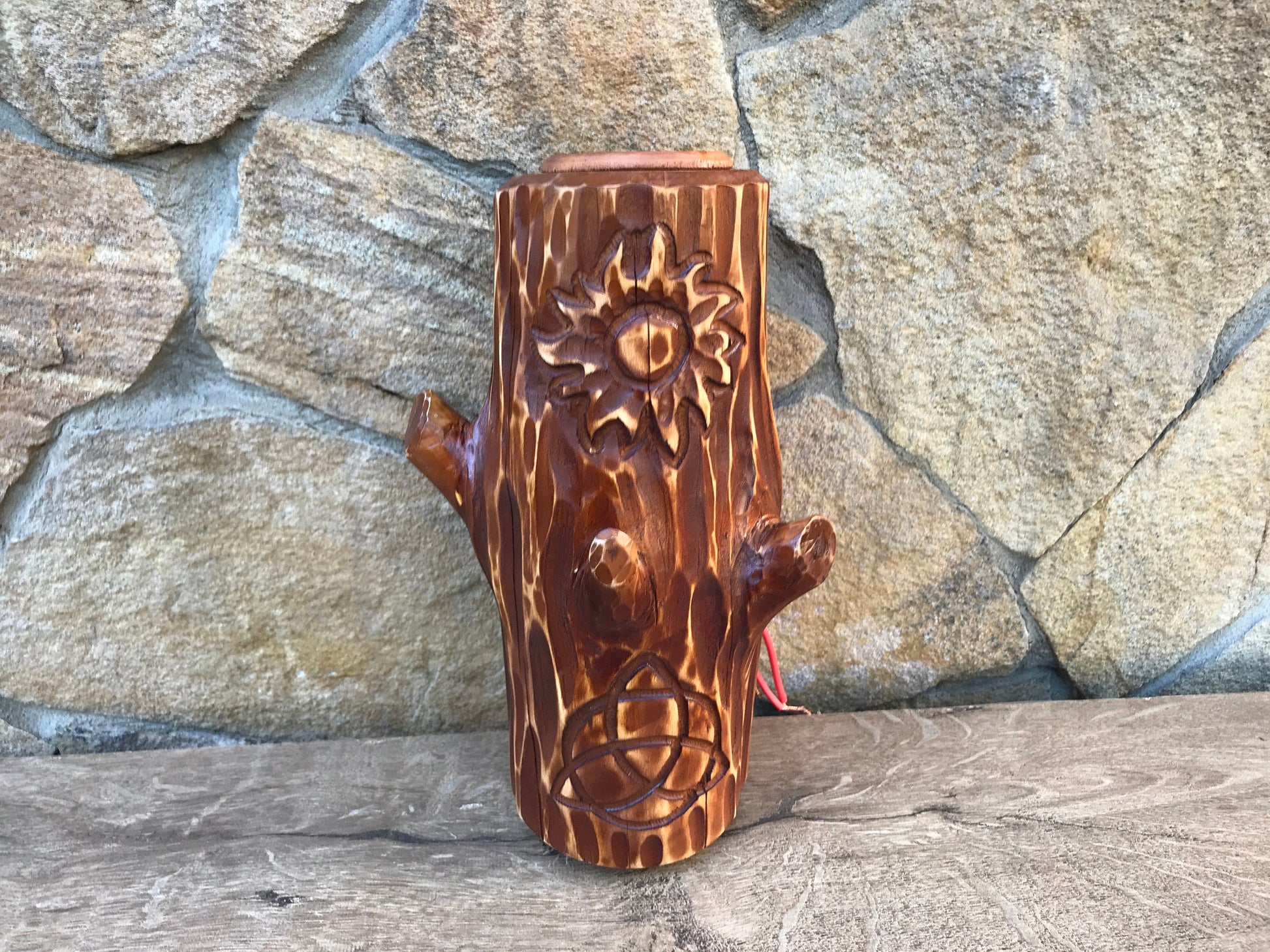 A wall lamp can be not a usual lamp but a masterpiece which can decorate your home and outlines the features of your home interior/exterior. Here is a wooden sconce with two engraved images (triskelion, sun). It is fixed to a wall. You will not find anything similar to it. It is very decorative! It can serve as a lantern for your porch or entryway lamp or inside house lamp. A wood has a nice surface structure. This authentic lamp creates a medieval atmosphere! A nice addition to your cabin / man cave.