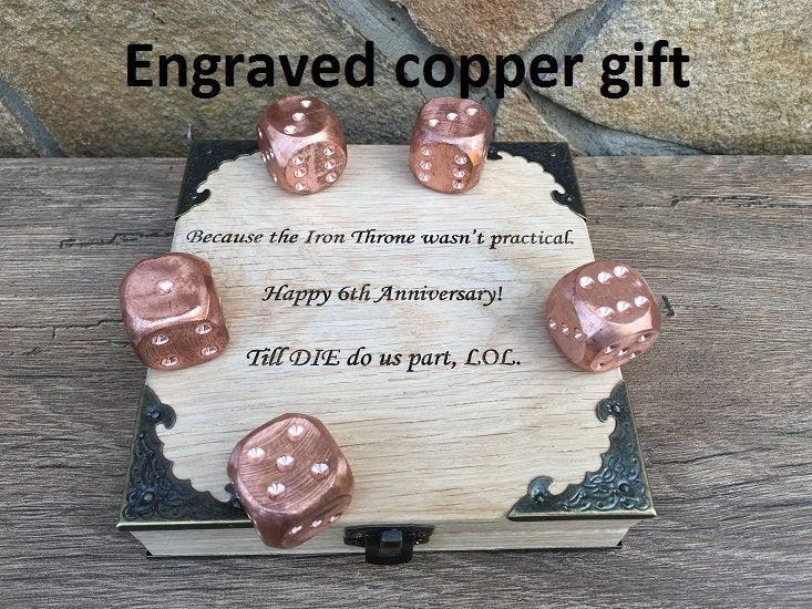 These hand made 5 copper dices will be sure a topic of everyone's interest at your next gaming event! They have incredible awesome copper color! Plus you will have a dice storage box with engraving/personalization.